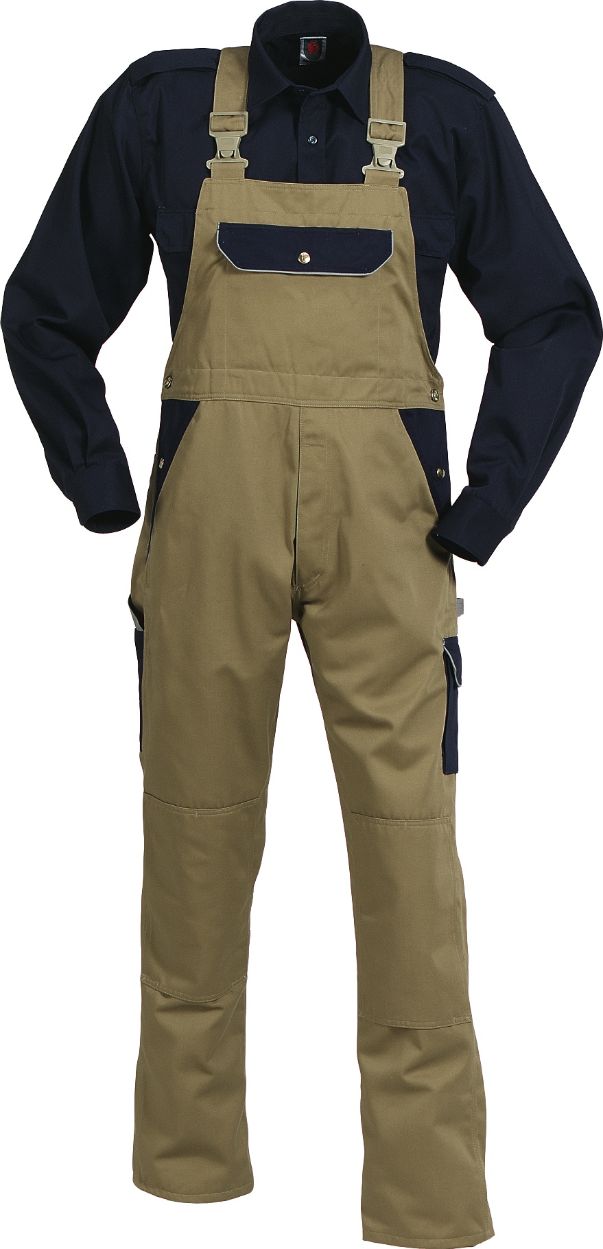 Dreifarbige Latzhose mit Knietaschen. Dreifache Kappnähte an Innen- und Außenseite der Beine sowie im Schritt. Regulierbarer Bund (5 cm). Hosenschlitz mit Metallreißverschluss. Zwei Eingrifftaschen. Große Latztasche mit Patte und Kugelschreibertaschen. Latzinnentasche. Verstellbare Schulterträger aus Stoff mit Kunststoffschnallen und kurzem, kräftigem Gummizug. Zwei verstärkte Gesäßtaschen, verstärkte Zollstocktasche. Hammerschlaufe. Schenkeltasche mit Dehnfalte und Patte. Schrittlänge 82 cm.