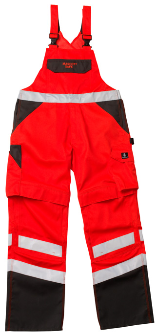 Zweifarbige Mascot Safe Young Warnschutz-Latzhose, floureszierend und mit schrägverlaufenden Reflexen. Teflon®-behandelt, schmutzabweisend. Dreifache Kappnähte an den Beinen und im Schritt. Schulterträger aus Stoff, verstellbar und mit kurzem, kräftigen Gummizug sowie Kunststoffschnallen versehen. Latztasche mit Kugelschreiberfach und Patte mit Druckknöpfen. Innentasche mit Klettverschluss. Weitenverstellbarer Bund. Vordertaschen. Ergonomisch geformte Hosenbeine. Hosenschlitz mit Reißverschluss. Verstärkte Gesäßtaschen mit Patte und Klettverschluss. Hammerschlaufe. Schenkeltasche mit Patte und Klettverschluss. Handyschenkeltasche mit Reißverschluss. Zollstocktasche mit kleiner Tasche außen. Kugelschreibertasche. Knietaschen sind höhenregulierbar und mit Patte, Eingriff von oben. Schrittlänge 82 cm.