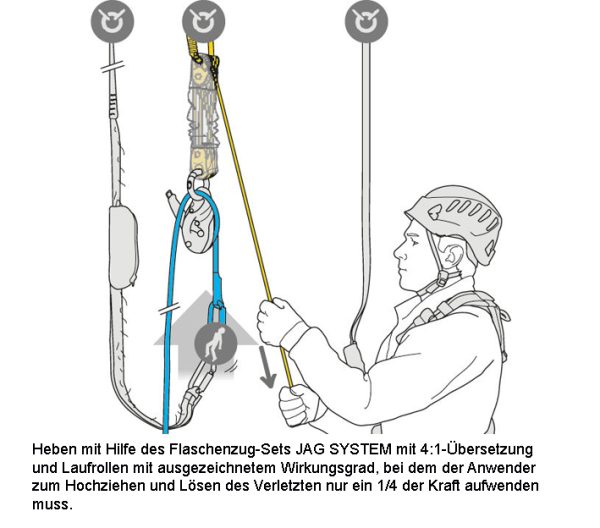 – Lösen mit Hilfe des Flaschenzug-Sets JAG SYSTEM mit 4:1-Übersetzung und Laufrollen mit hohem Wirkungsgrad, bei dem der Anwender zum Hochziehen und Lösen des Verletzten nur ein Viertel der Kraft aufwenden muss.